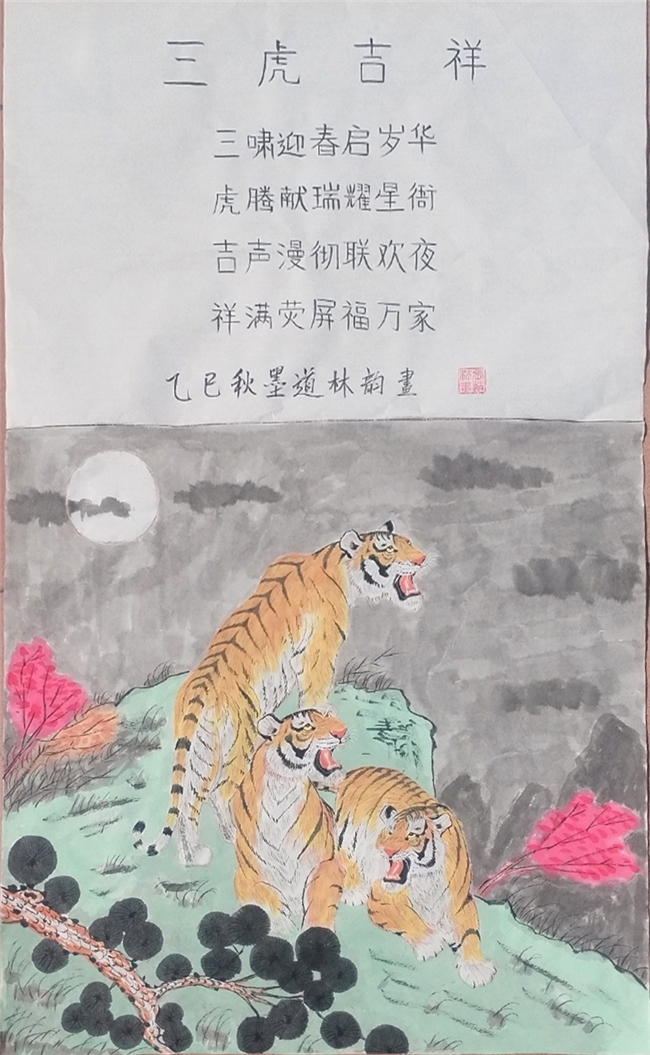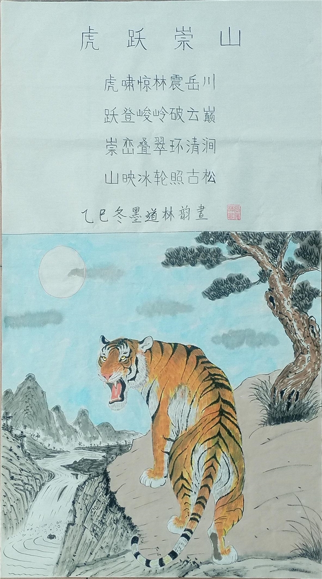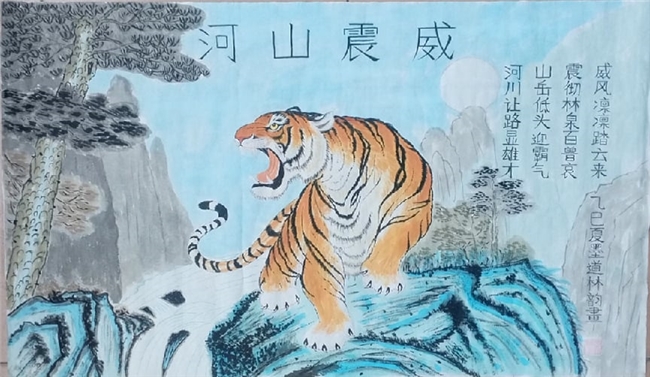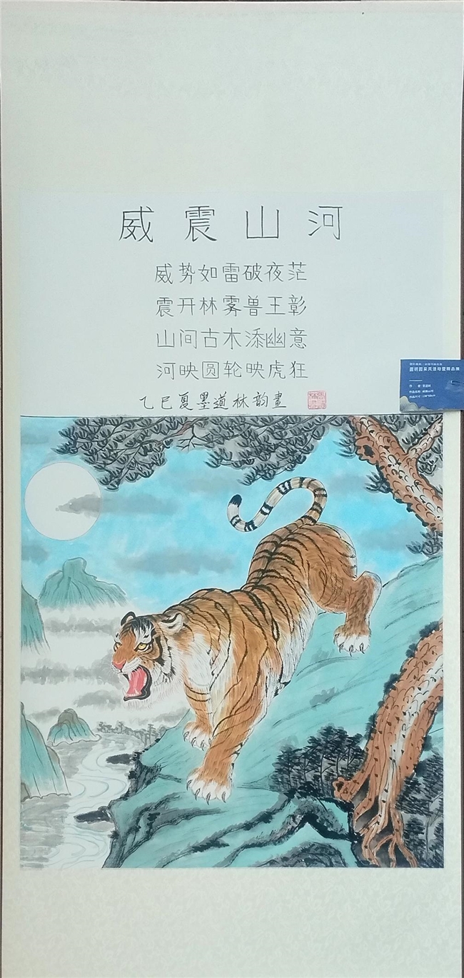 2025年,先生的艺术足迹进一步延伸,北京地铁巡展、圆明园专题展览等重要平台,让笔墨书香与非遗魅力浸润城市地标,走进寻常百姓视野。《威震山河》《三虎吉祥》《马到成功》等代表作中,猛虎雄烈如惊雷破崖,骏马昂扬似长风逐云,在细腻笔法与鲜明色彩的交织中跃然纸上。其中《威震山河》堪称经典:悬崖之上,猛虎腾跃而出,黄黑斑纹与灰色山石形成强烈视觉冲击,锐利眼神中透着百兽之王的威严,遒劲笔墨里藏着中华民族的精神气魄,更暗含非遗技法的精妙传承,被业界评委盛赞“形神兼备,气韵贯通”,成为向世界友人展示中华书画独特魅力与非遗文化深厚底蕴的生动载体。从机场贵宾厅到城市公共空间,从外交文化交流场景到国际艺术舞台,他的作品以艺术为通用语言,让东方美学与非遗文化跨越语言与地域的界限,绽放独特光彩。